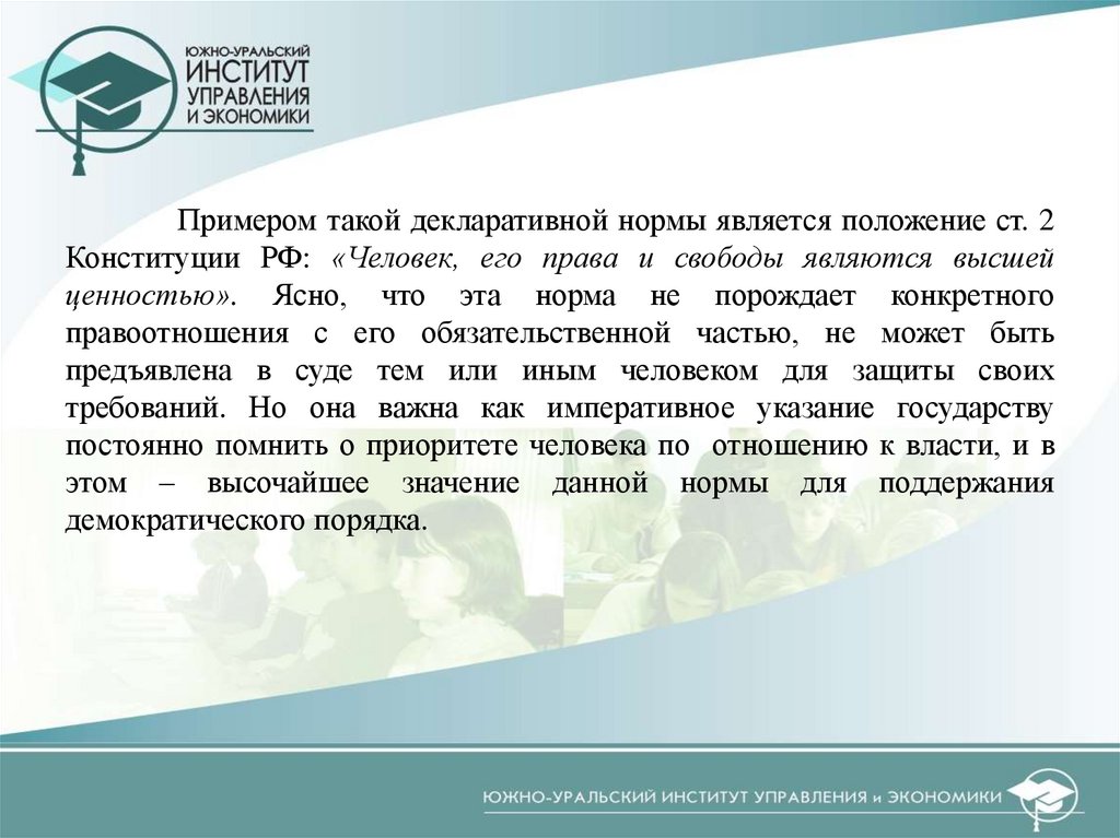 Примером такой декларативной нормы является положение ст. 2Конституции РФ: «Человек, его права и свободы являются высшей