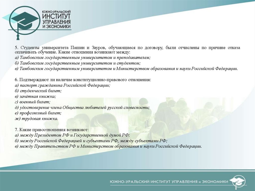 5. Студенты университета Пашин и Зауров, обучающиеся по договору, были отчислены по причине отказаоплачивать обучение. Какие отношения возникают между: