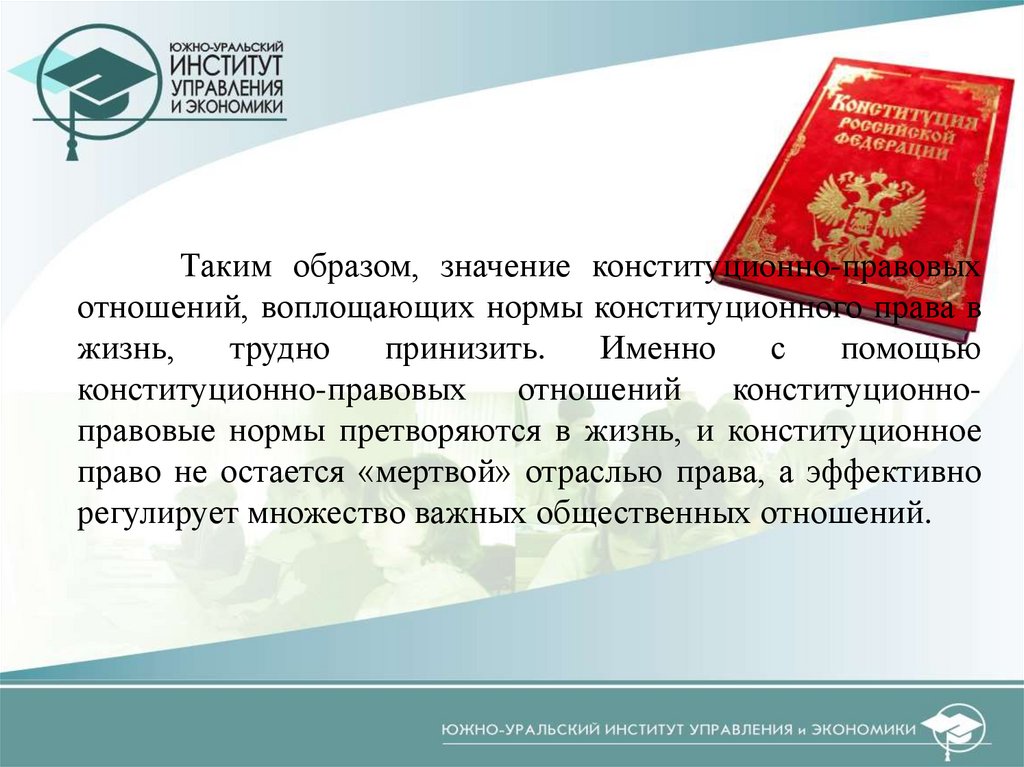 Таким образом, значение конституционно-правовыхотношений, воплощающих нормы конституционного права в