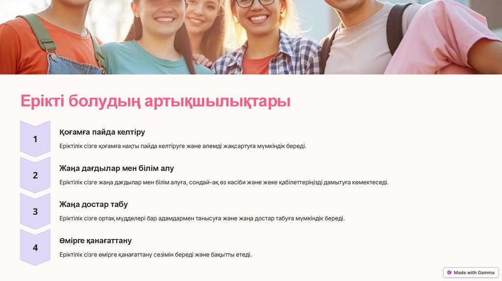Еріктілік сізге ортақ мүдделері бар адамдармен танысуға және жаңа достар табуға мүмкіндік береді.