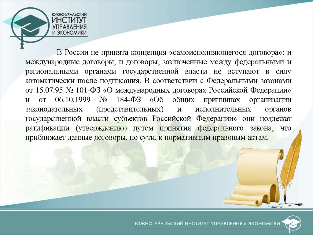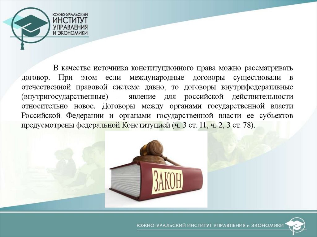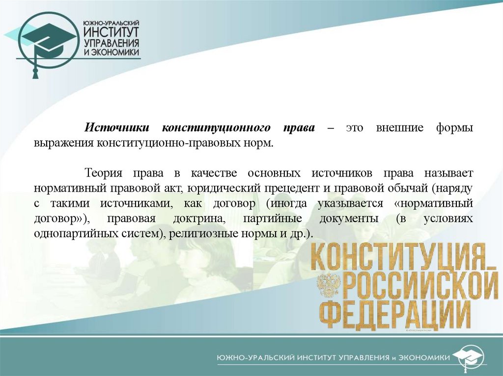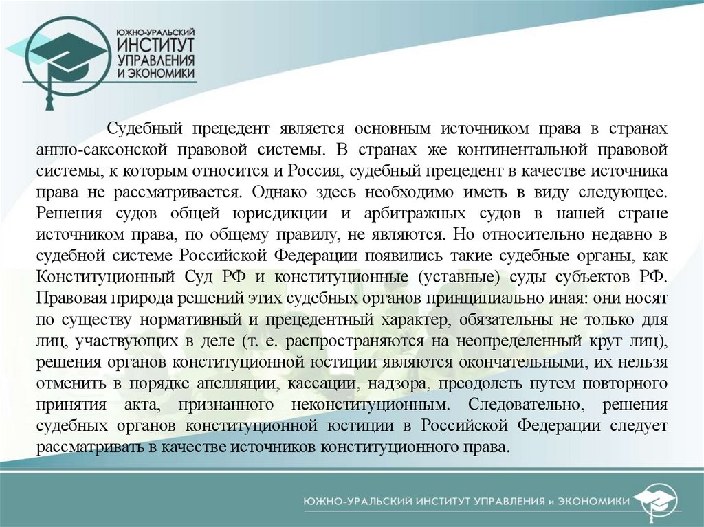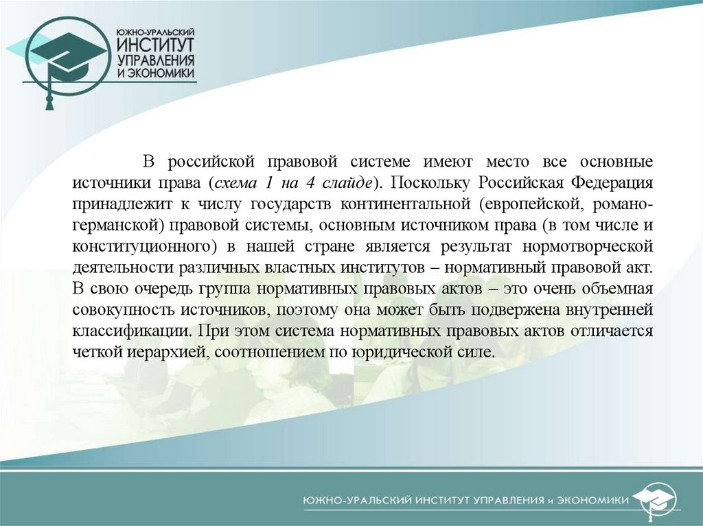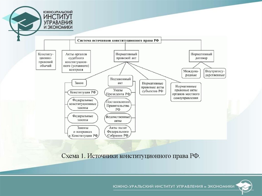 В российской правовой системе имеют место все основныеисточники права (схема 1 на 4 слайде). Поскольку Российская Федерация