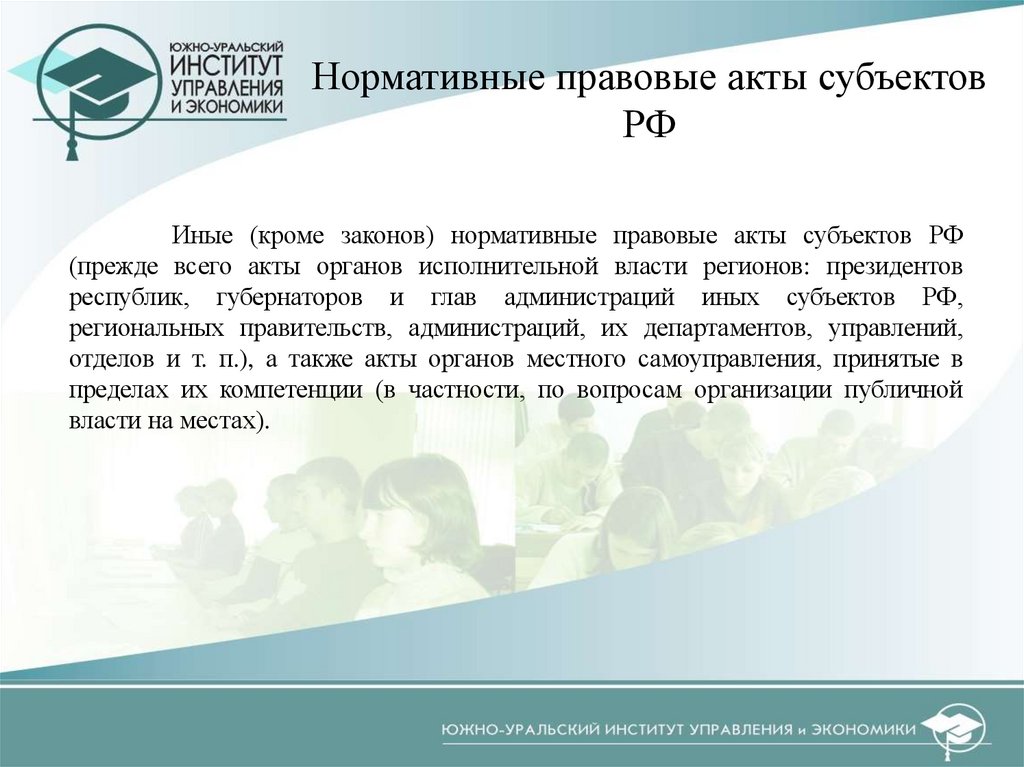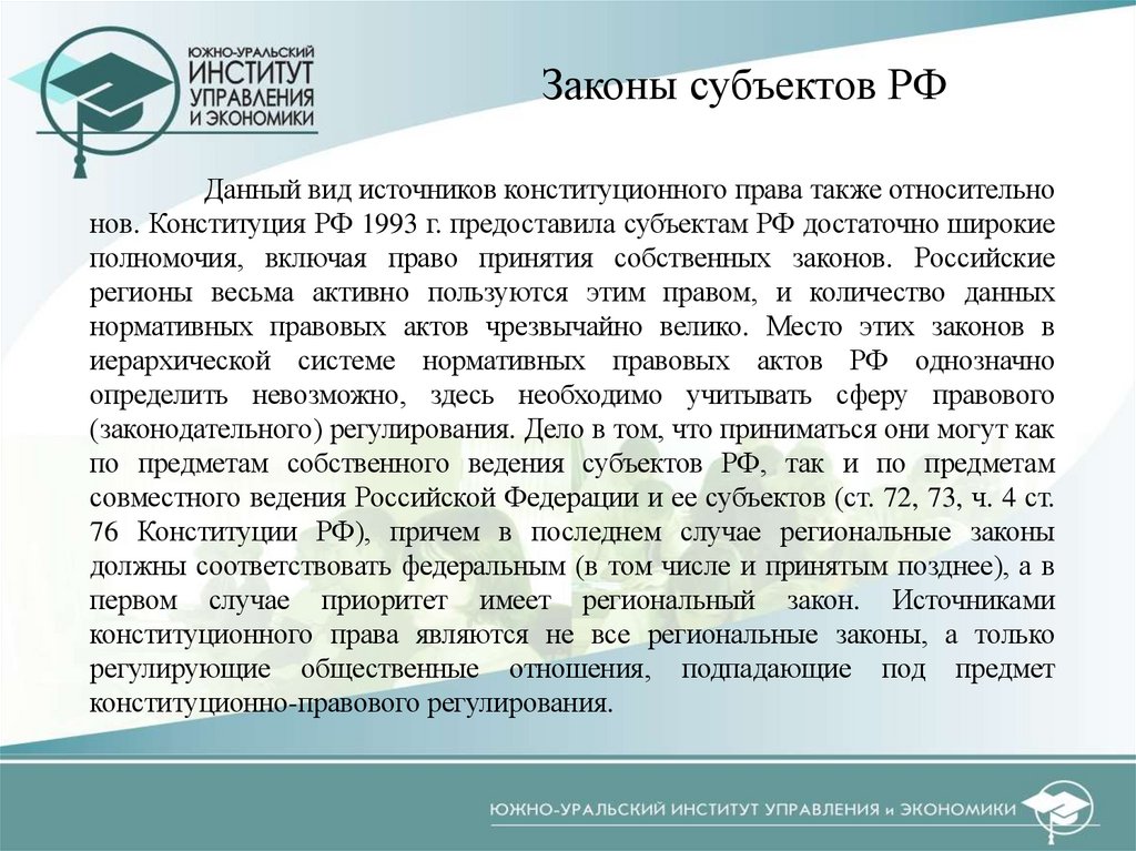 (уставами), законами субъектов РФ, уставами муниципальных образований.