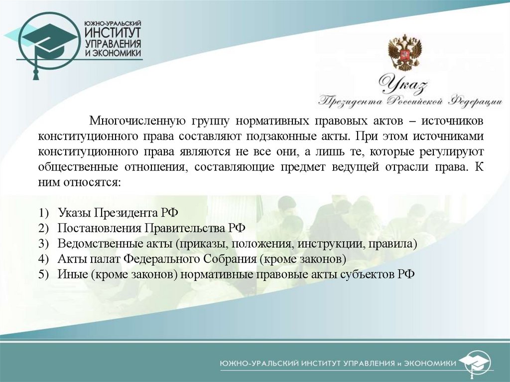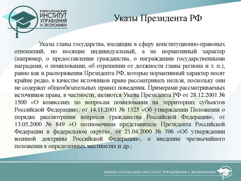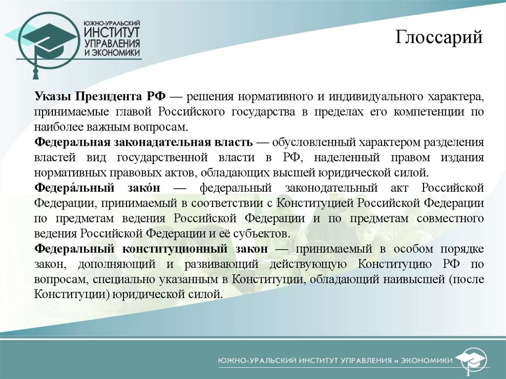ГлоссарийУказы Президента РФ — решения нормативного и индивидуального характера,