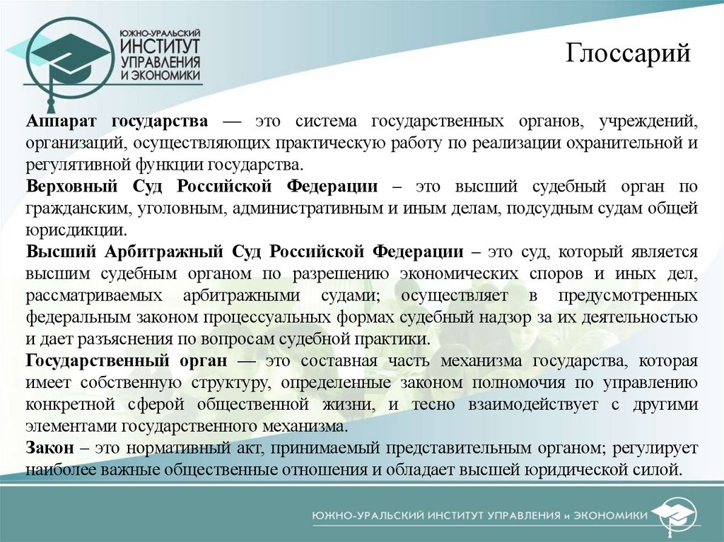 ГлоссарийАппарат государства — это система государственных органов, учреждений,