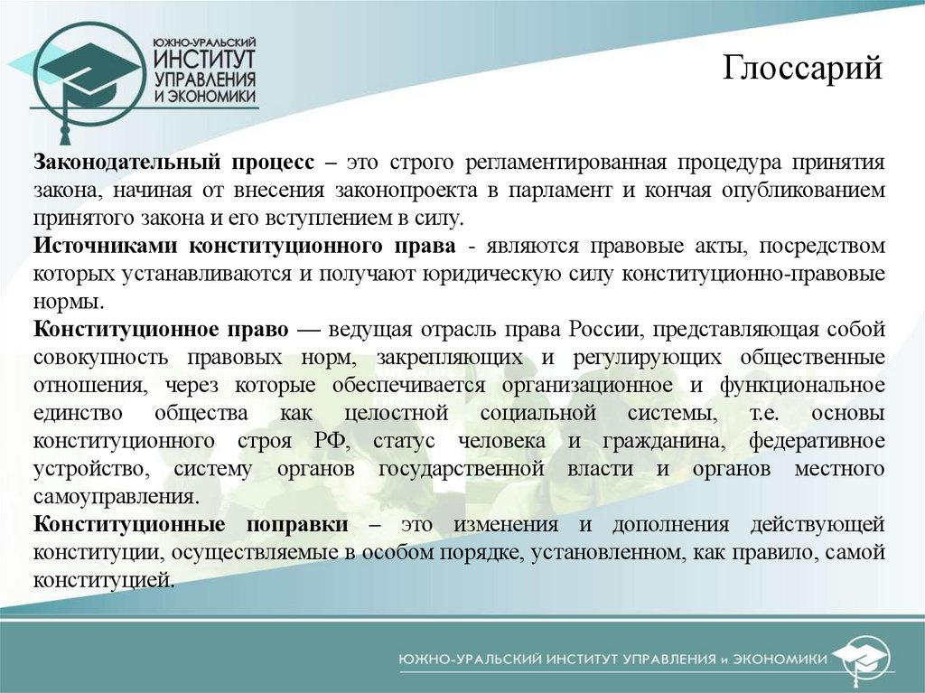 ГлоссарийЗаконодательный процесс – это строго регламентированная процедура принятия