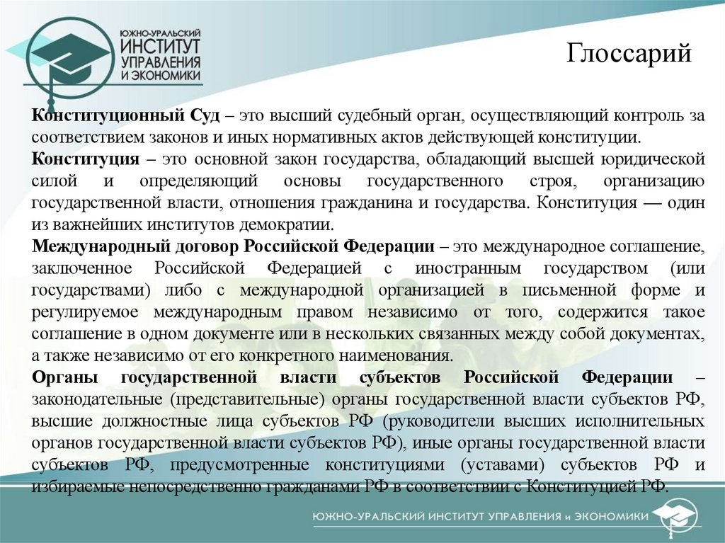 ГлоссарийКонституционный Суд – это высший судебный орган, осуществляющий контроль за