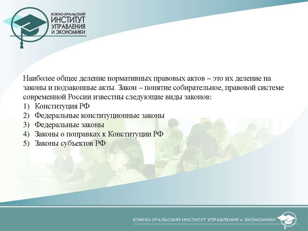 Наиболее общее деление нормативных правовых актов – это их деление назаконы и подзаконные акты. Закон – понятие собирательное, правовой системе