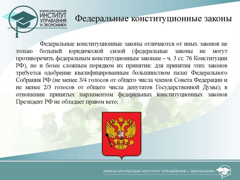 Федеральные конституционные законыФедеральные конституционные законы отличаются от иных законов не