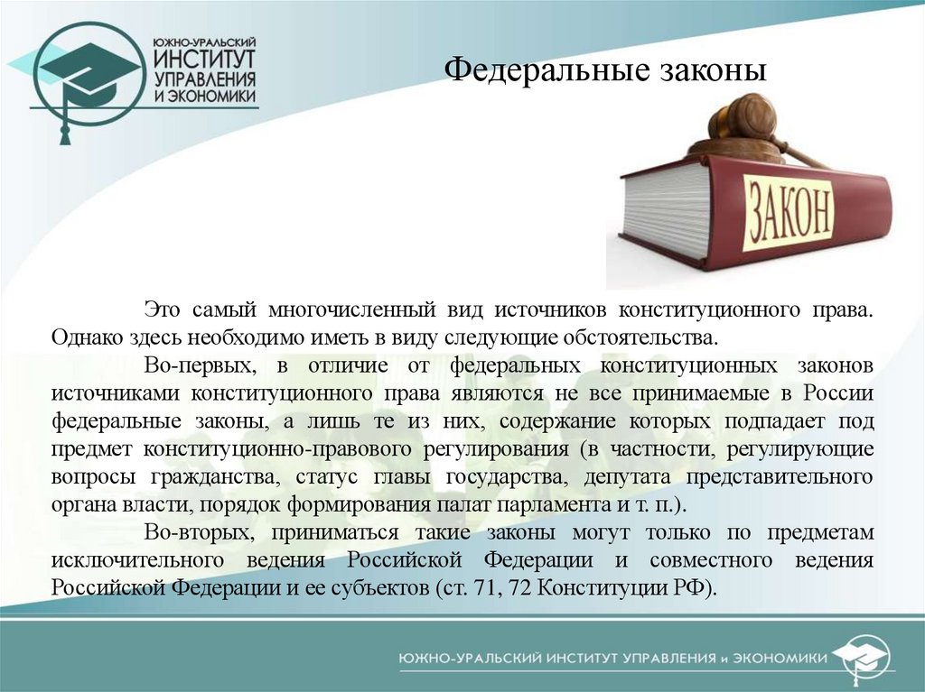 Федеральные законыЭто самый многочисленный вид источников конституционного права.
