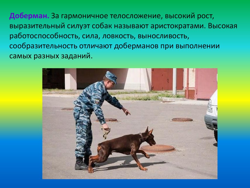 Доберман. За гармоничное телосложение, высокий рост,выразительный силуэт собак называют аристократами. Высокая