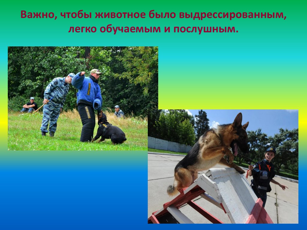 Важно, чтобы животное было выдрессированным,легко обучаемым и послушным.