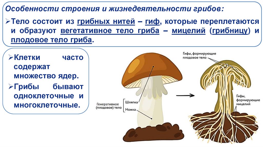 ножки и шляпки, вегетативное тело – грибница (мицелий),