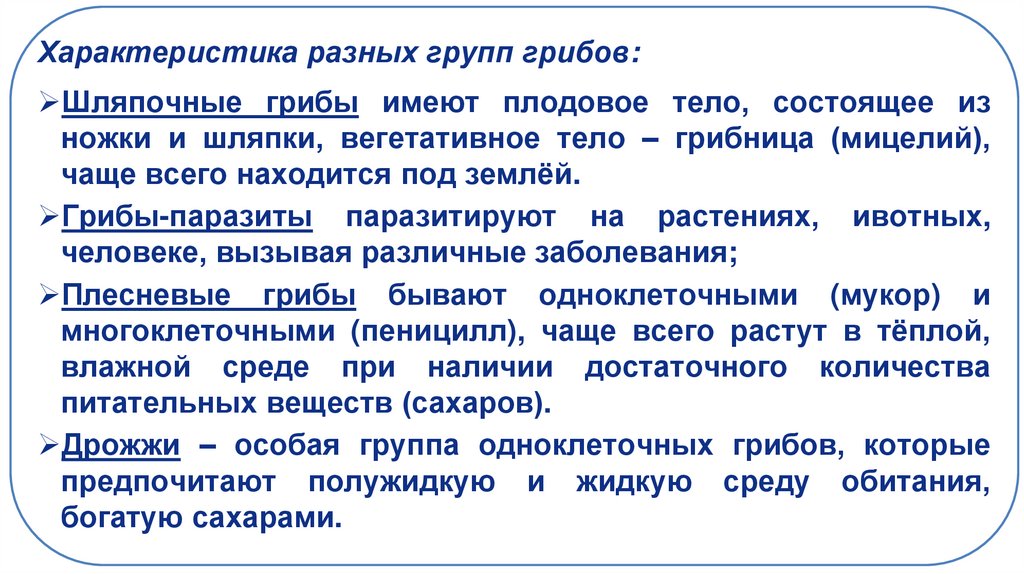 Характеристика разных групп грибов:Шляпочные грибы имеют плодовое тело, состоящее из