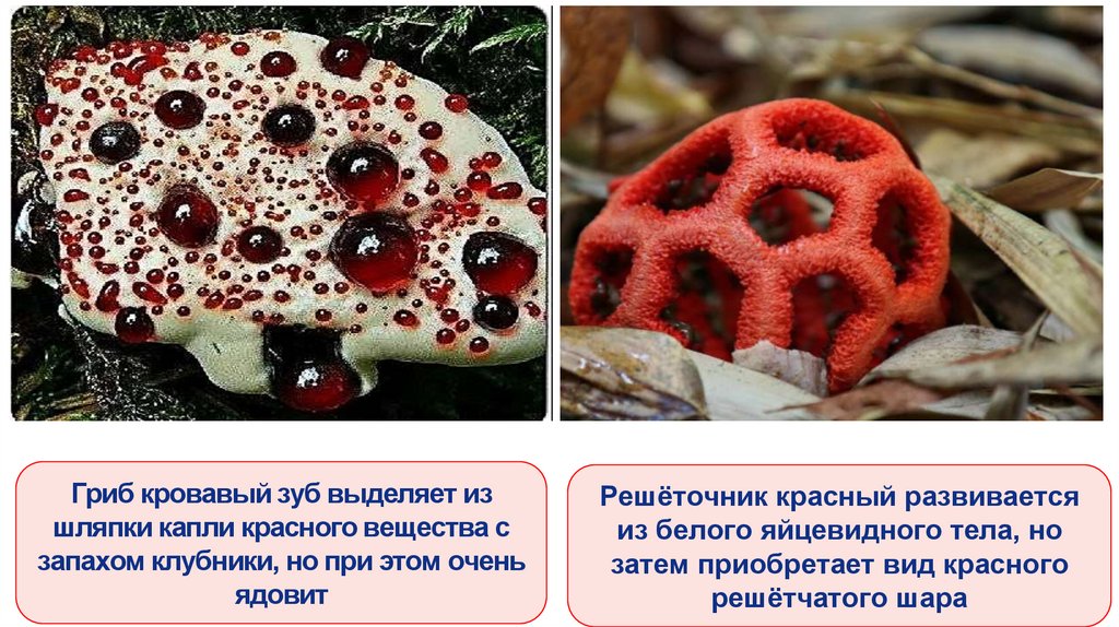 Гриб кровавый зуб выделяет изшляпки капли красного вещества с