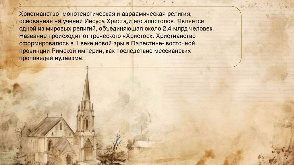 Христианство- монотеистическая и авраамическая религия,основанная на учении Иисуса Христа и его апостолов. Является