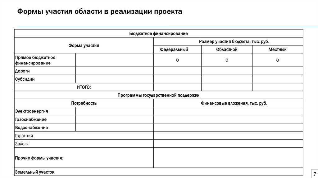 Формы участия области в реализации проектаБюджетное финансирование