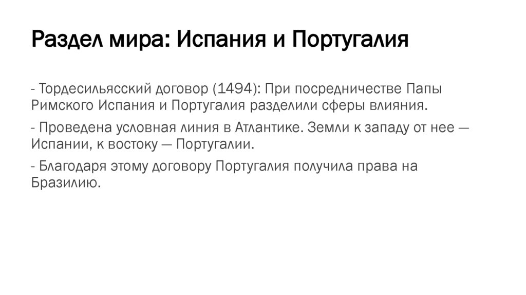 Раздел мира: Испания и Португалия- Тордесильясский договор (1494): При посредничестве Папы