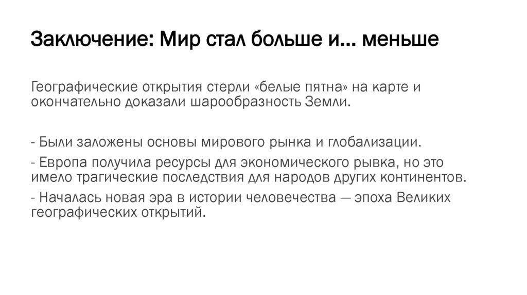 Заключение: Мир стал больше и... меньшеГеографические открытия стерли «белые пятна» на карте и