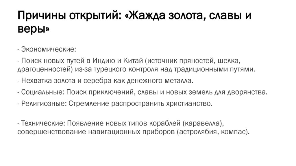 - Поиск новых путей в Индию и Китай (источник пряностей, шелка,