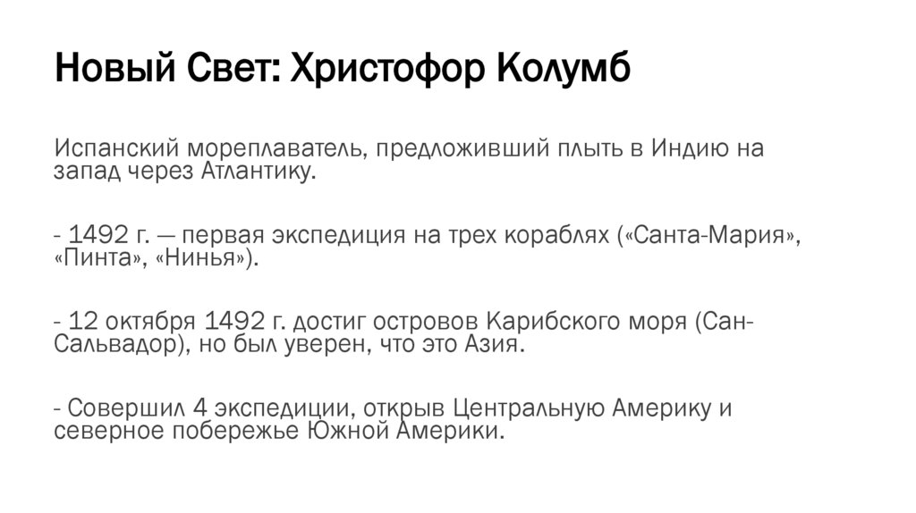 - 12 октября 1492 г. достиг островов Карибского моря (СанСальвадор), но был уверен, что это Азия.