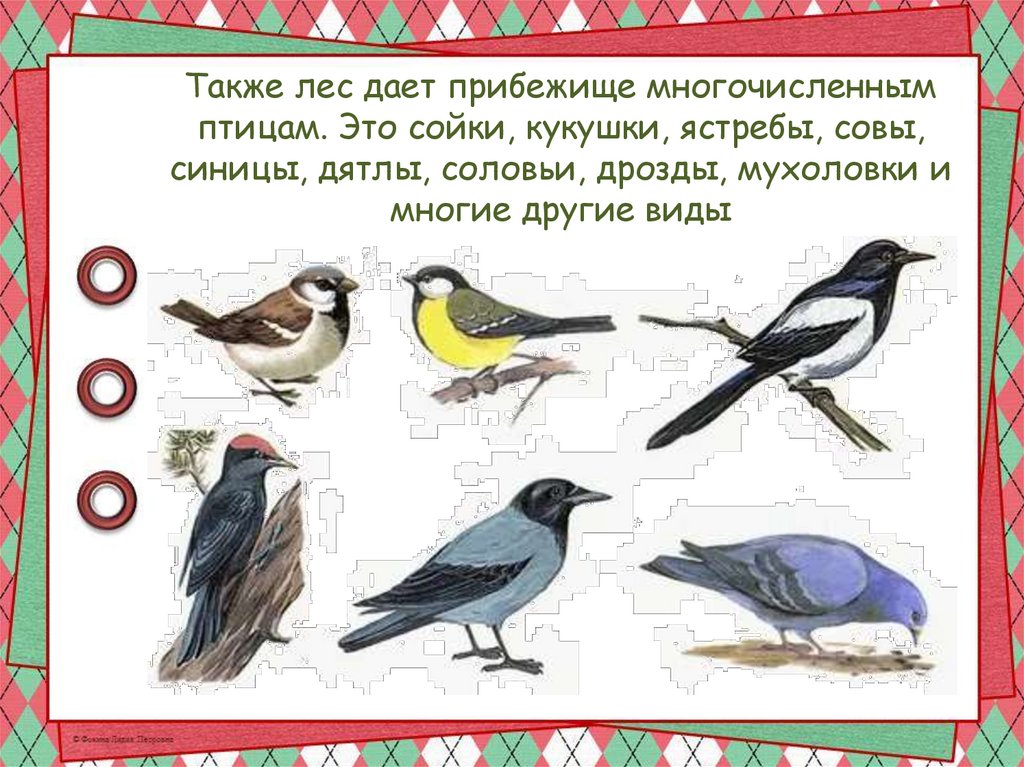 синицы, дятлы, соловьи, дрозды, мухоловки и