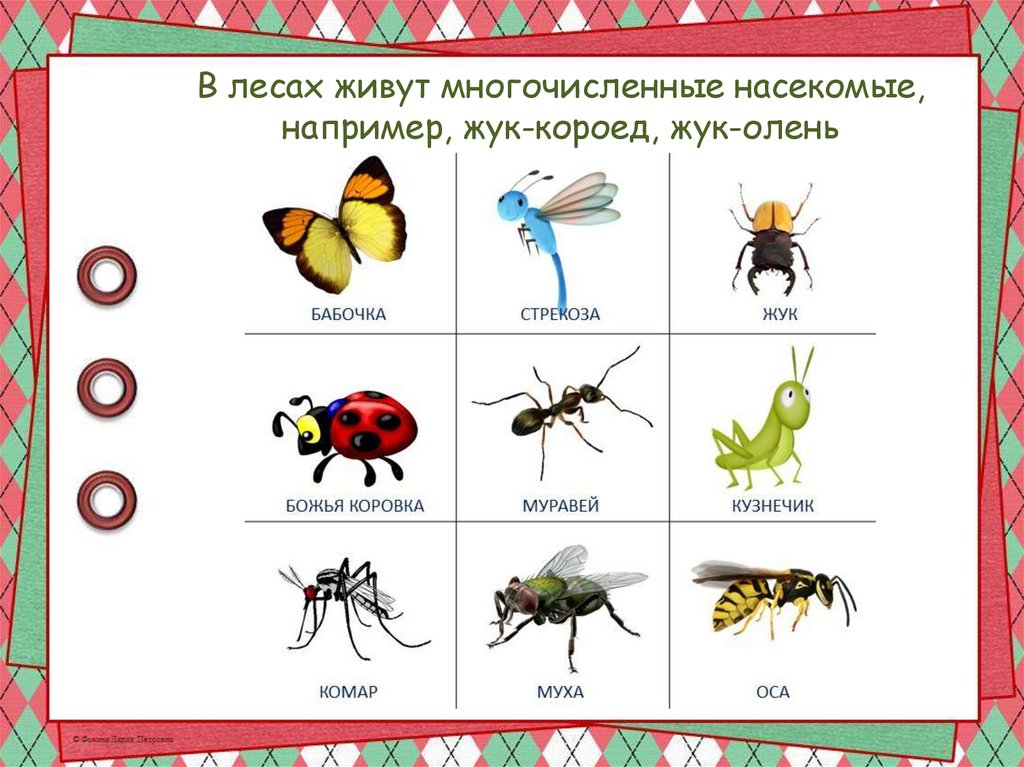 В лесах живут многочисленные насекомые,например, жук-короед, жук-олень
