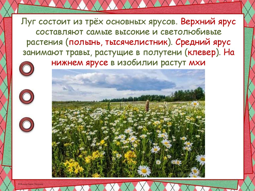 Луг состоит из трёх основных ярусов. Верхний яруссоставляют самые высокие и светолюбивые