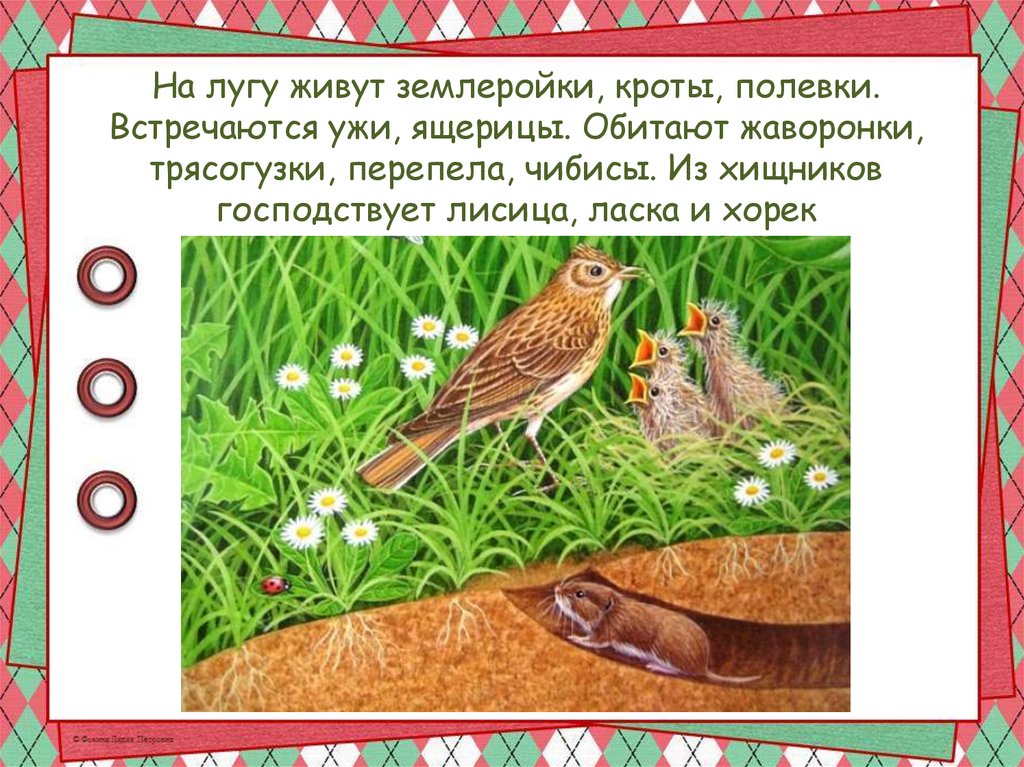 На лугу живут землеройки, кроты, полевки.Встречаются ужи, ящерицы. Обитают жаворонки,