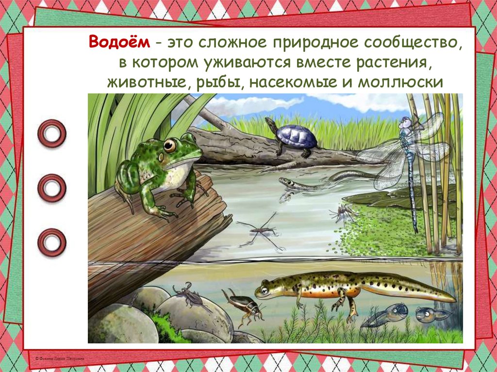 Водоём - это сложное природное сообщество,в котором уживаются вместе растения,