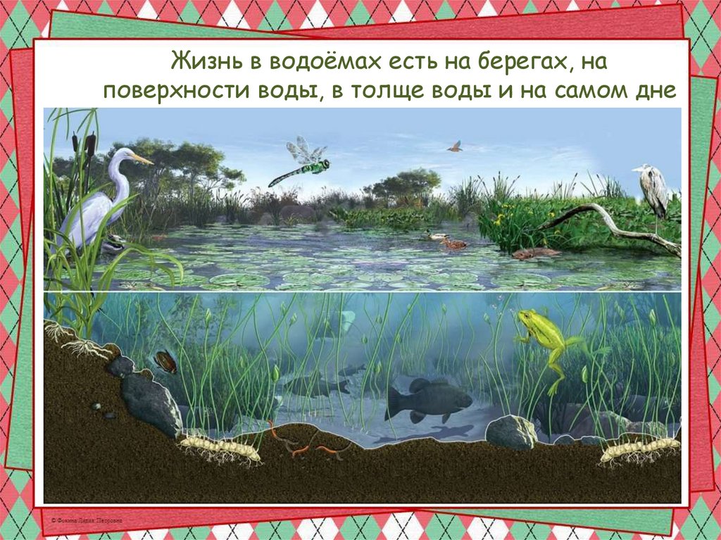 Жизнь в водоёмах есть на берегах, наповерхности воды, в толще воды и на самом дне