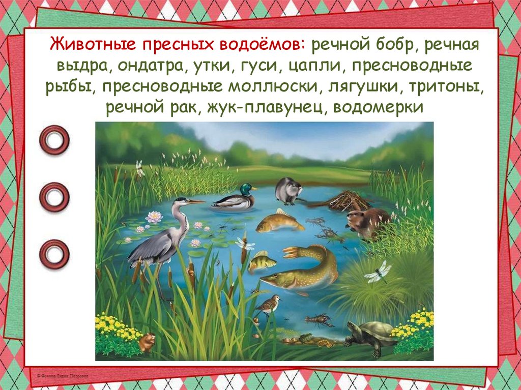 Животные пресных водоёмов: речной бобр, речнаявыдра, ондатра, утки, гуси, цапли, пресноводные