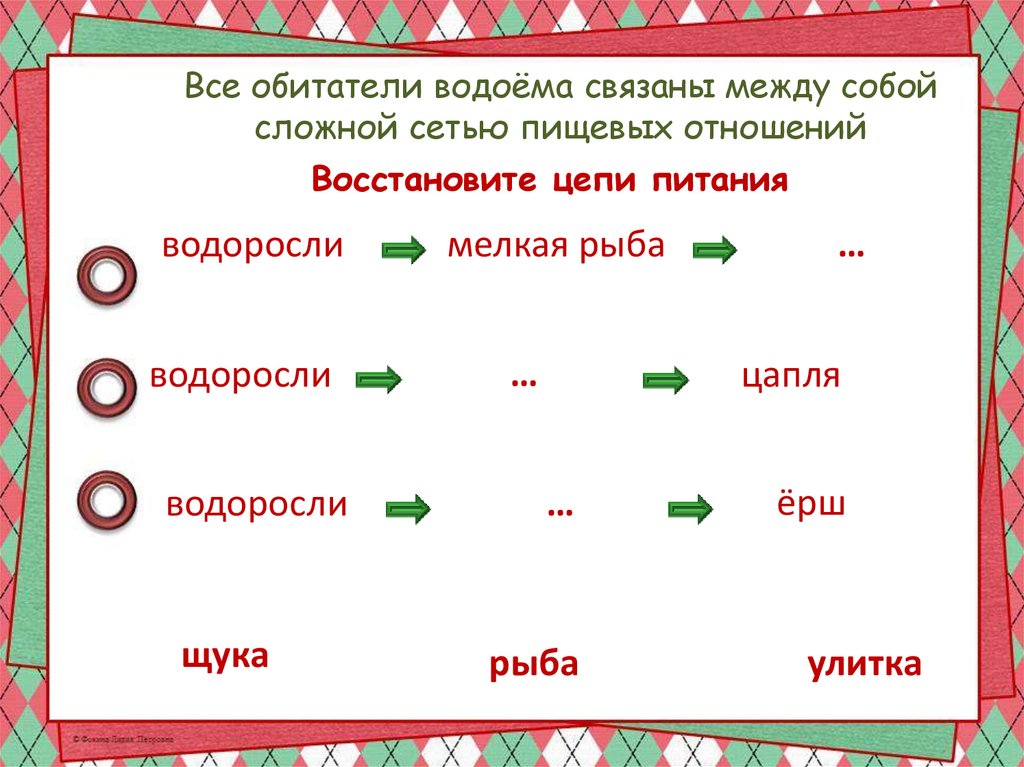 Все обитатели водоёма связаны между собойсложной сетью пищевых отношений
