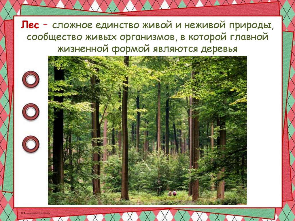 Лес – сложное единство живой и неживой природы,сообщество живых организмов, в которой главной