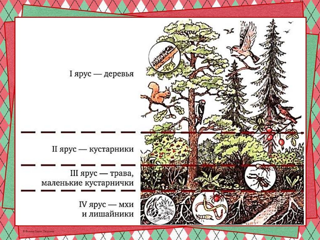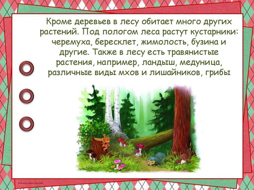 Кроме деревьев в лесу обитает много другихрастений. Под пологом леса растут кустарники: