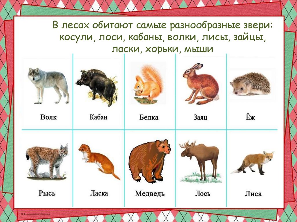 В лесах обитают самые разнообразные звери:косули, лоси, кабаны, волки, лисы, зайцы,