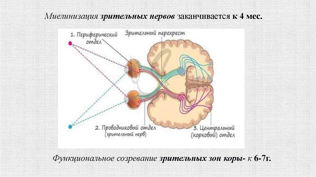 Миелинизация зрительных нервов заканчивается к 4 мес.Функциональное созревание зрительных зон коры- к 6-7г.