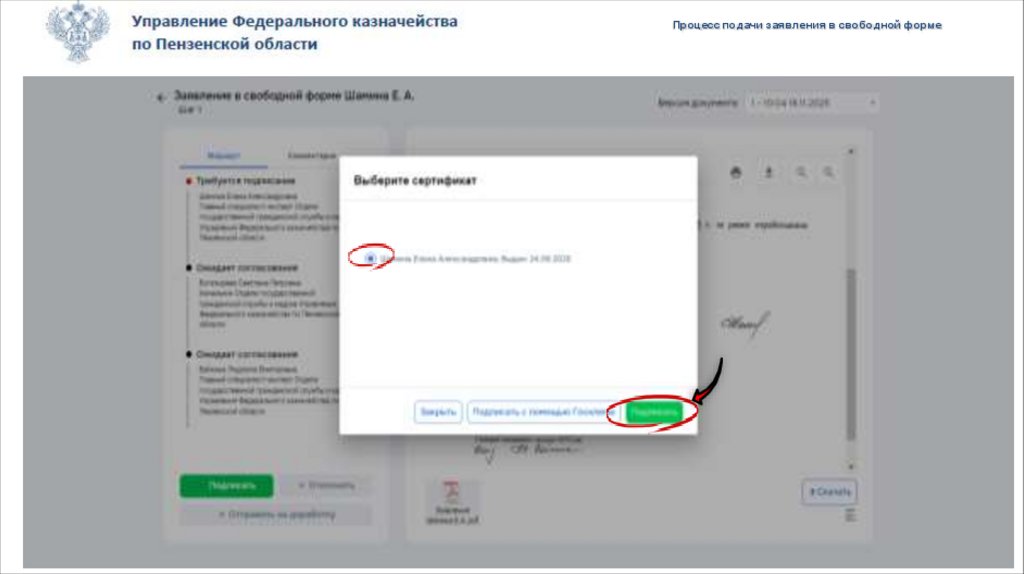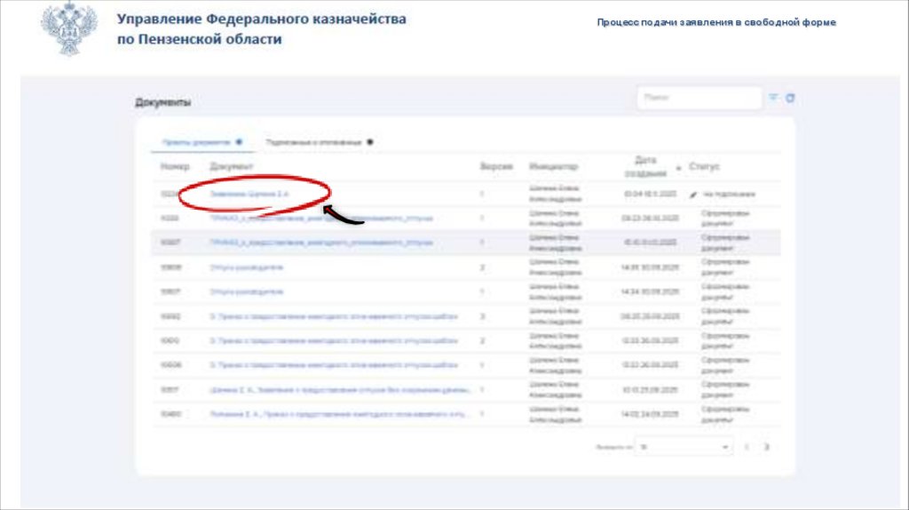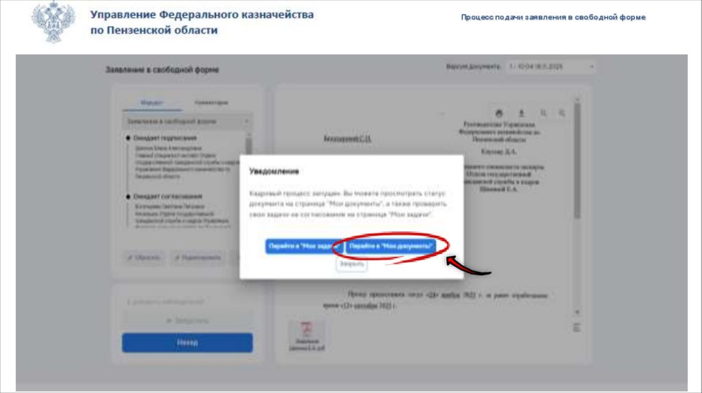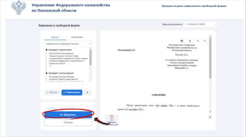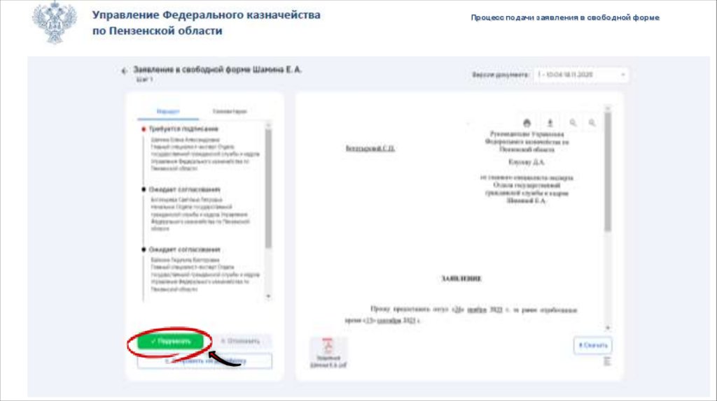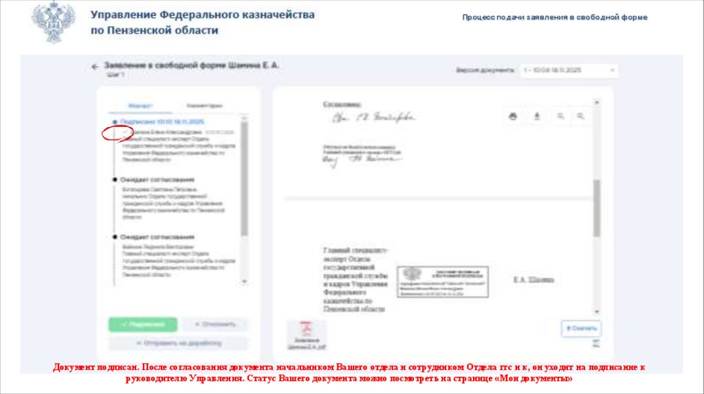 Процесс подачи заявления в свободной формеДокумент подписан. После согласования документа начальником Вашего отдела и сотрудником Отдела ггс и к, он уходит на подписание к
