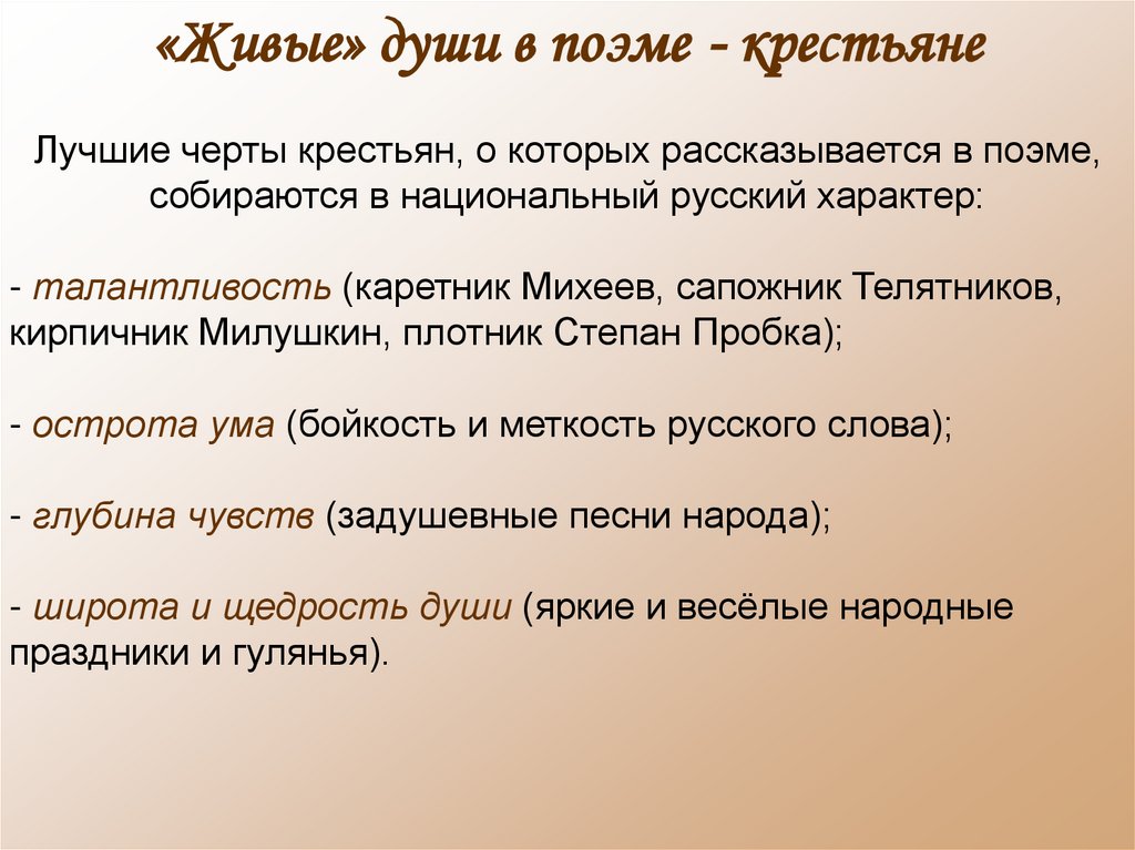 «Живые» души в поэме - крестьянеЛучшие черты крестьян, о которых рассказывается в поэме,