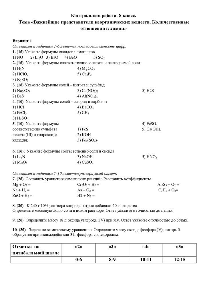Контрольная работа . 8 класс.Тема «Важнейшие представители неорганических веществ. Количественные