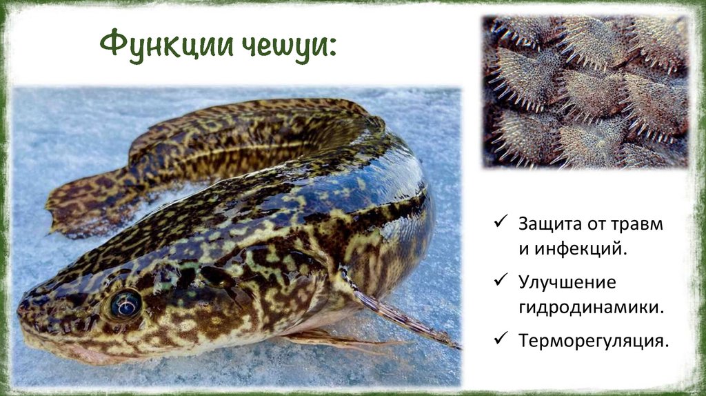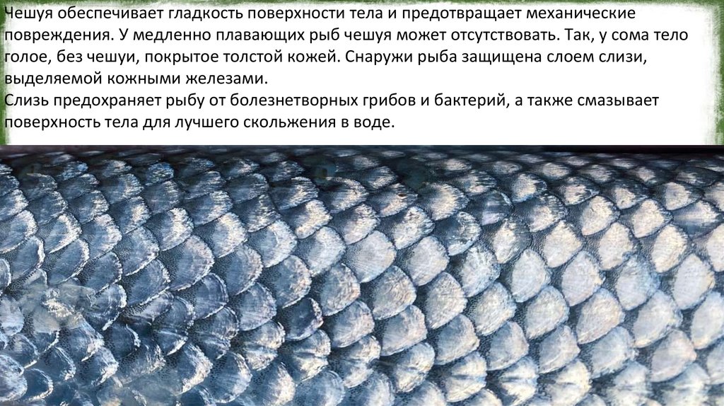 Чешуя обеспечивает гладкость поверхности тела и предотвращает механическиеповреждения. У медленно плавающих рыб чешуя может отсутствовать. Так, у сома тело