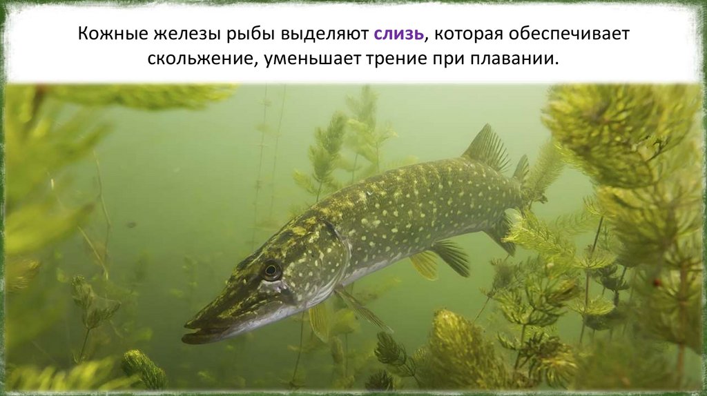 Кожные железы рыбы выделяют слизь, которая обеспечиваетскольжение, уменьшает трение при плавании.