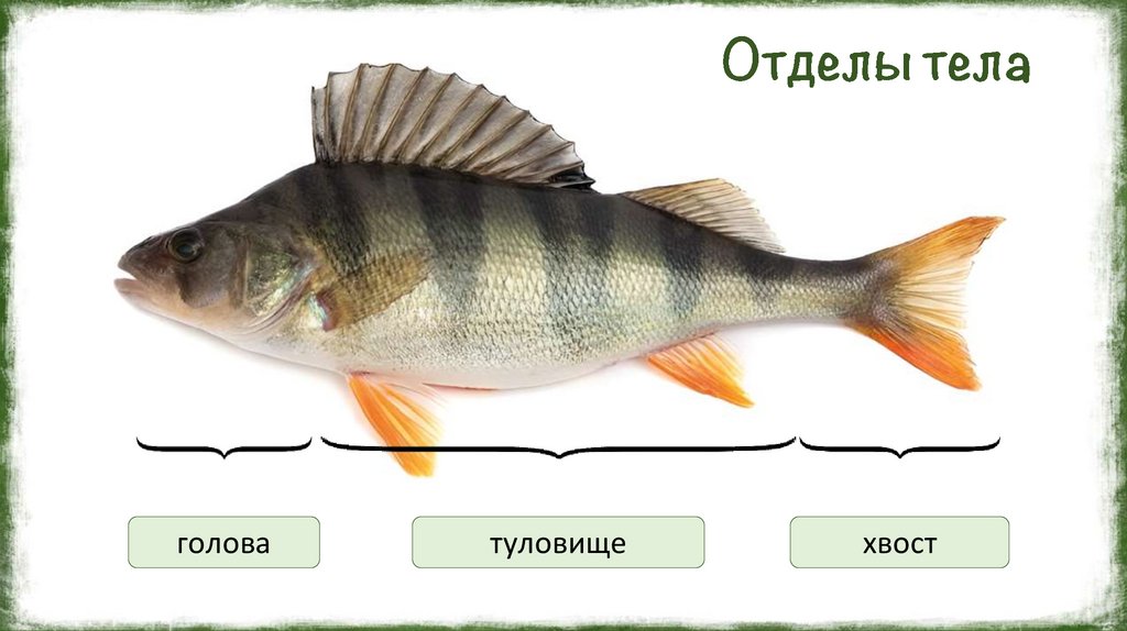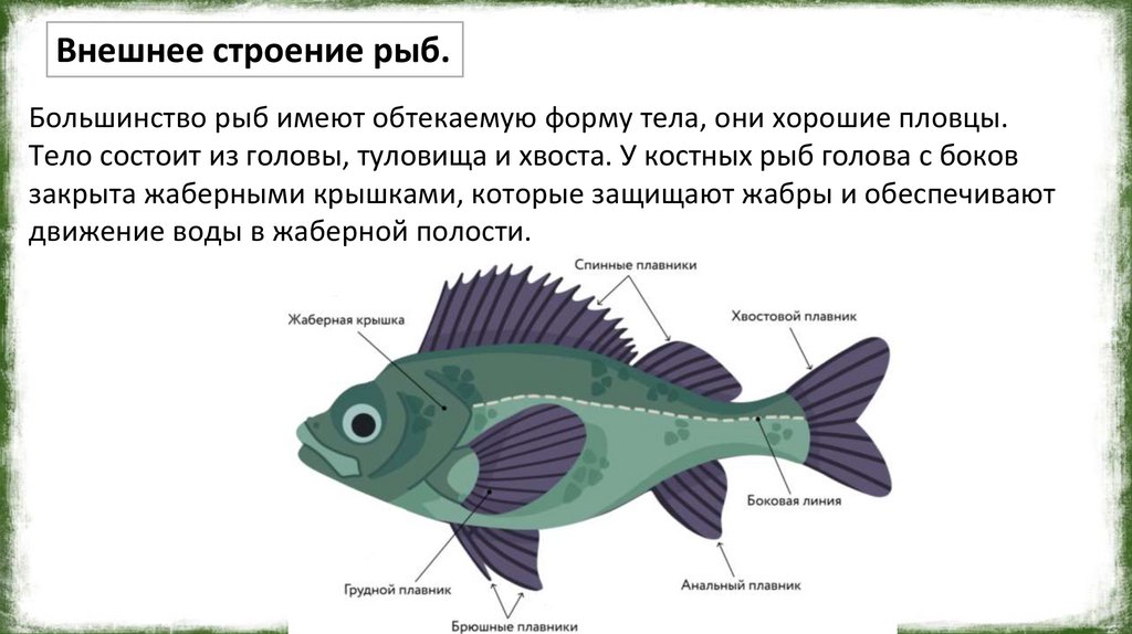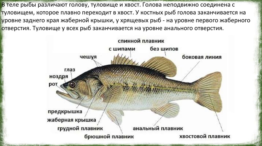 В теле рыбы различают голову, туловище и хвост. Голова неподвижно соединена стуловищем, которое плавно переходит в хвост. У костных рыб голова заканчивается на