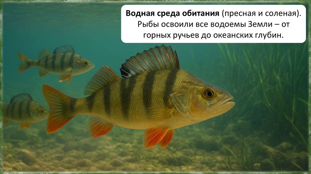 Рыбы — водные позвоночные животные, они широко распространены попланете, обитают в пресных и солёных водоёмах, заселяя всю толщу от