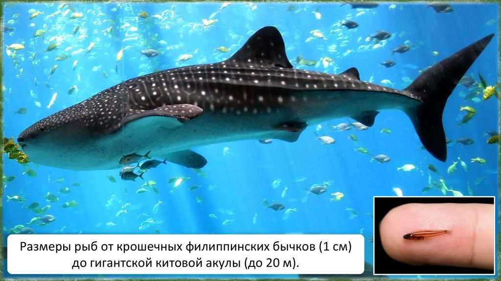 Размеры рыб от крошечных филиппинских бычков (1 см)до гигантской китовой акулы (до 20 м).