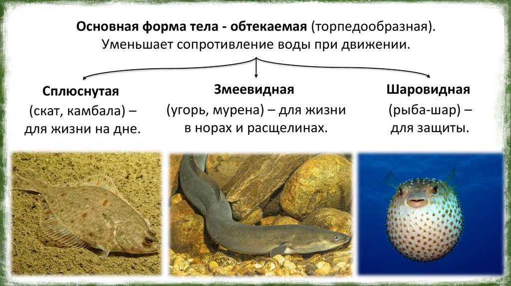 Основная форма тела - обтекаемая (торпедообразная).Уменьшает сопротивление воды при движении.