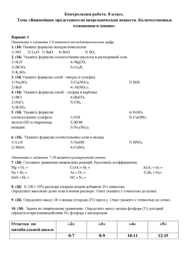 Контрольная работа. 8 класс.Тема «Важнейшие представители неорганических веществ. Количественные