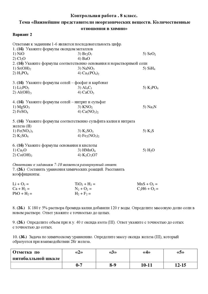 Контрольная работа . 8 класс.Тема «Важнейшие представители неорганических веществ. Количественные