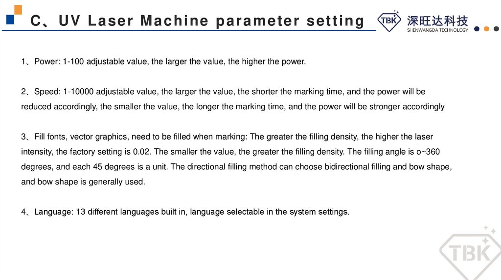 C、UV Laser Machine parameter setting1、Power: 1-100 adjustable value, the larger the value, the higher the power.