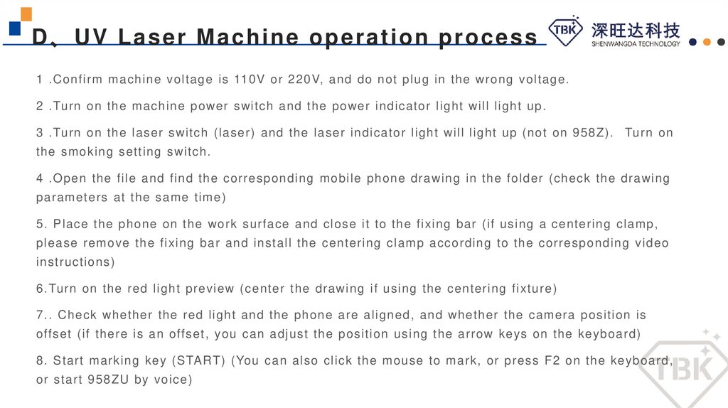 D、UV Laser Machine operation process1 .Confirm machine voltage is 110V or 220V, and do not plug in the wrong voltage.