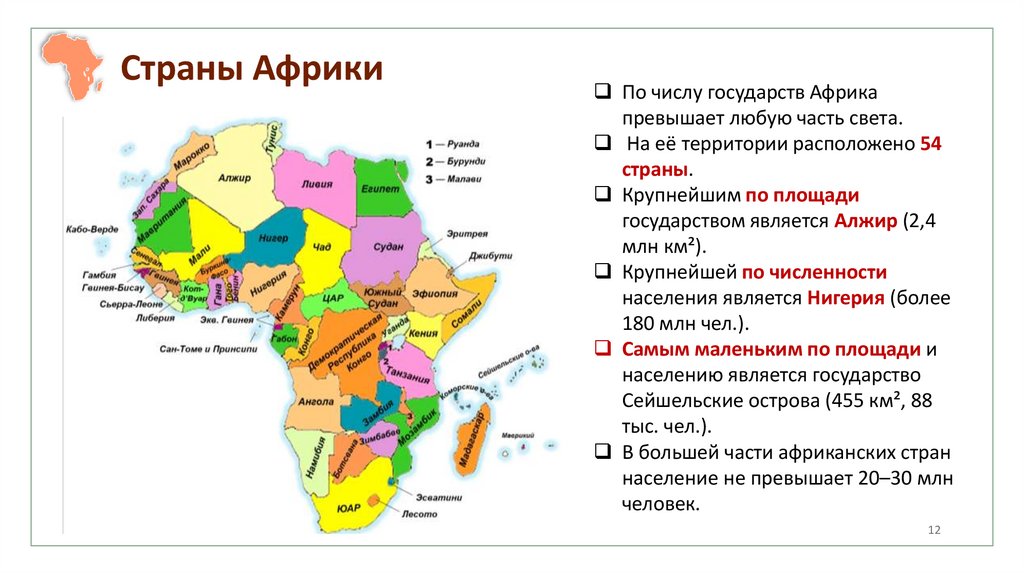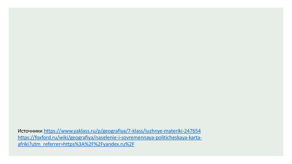 Источники https://www.yaklass.ru/p/geografiya/7-klass/iuzhnye-materiki-247654https://foxford.ru/wiki/geografiya/naselenie-i-sovremennaya-politicheskaya-kartaafriki?utm_referrer=https%3A%2F%2Fyandex.ru%2F